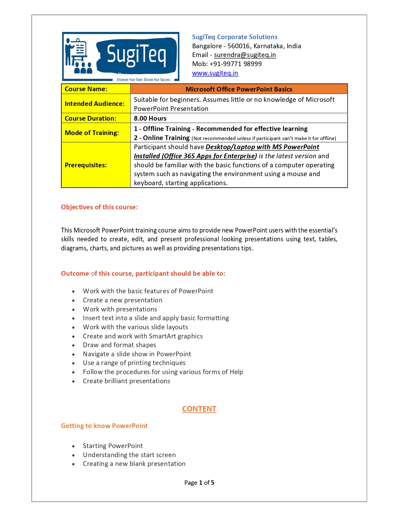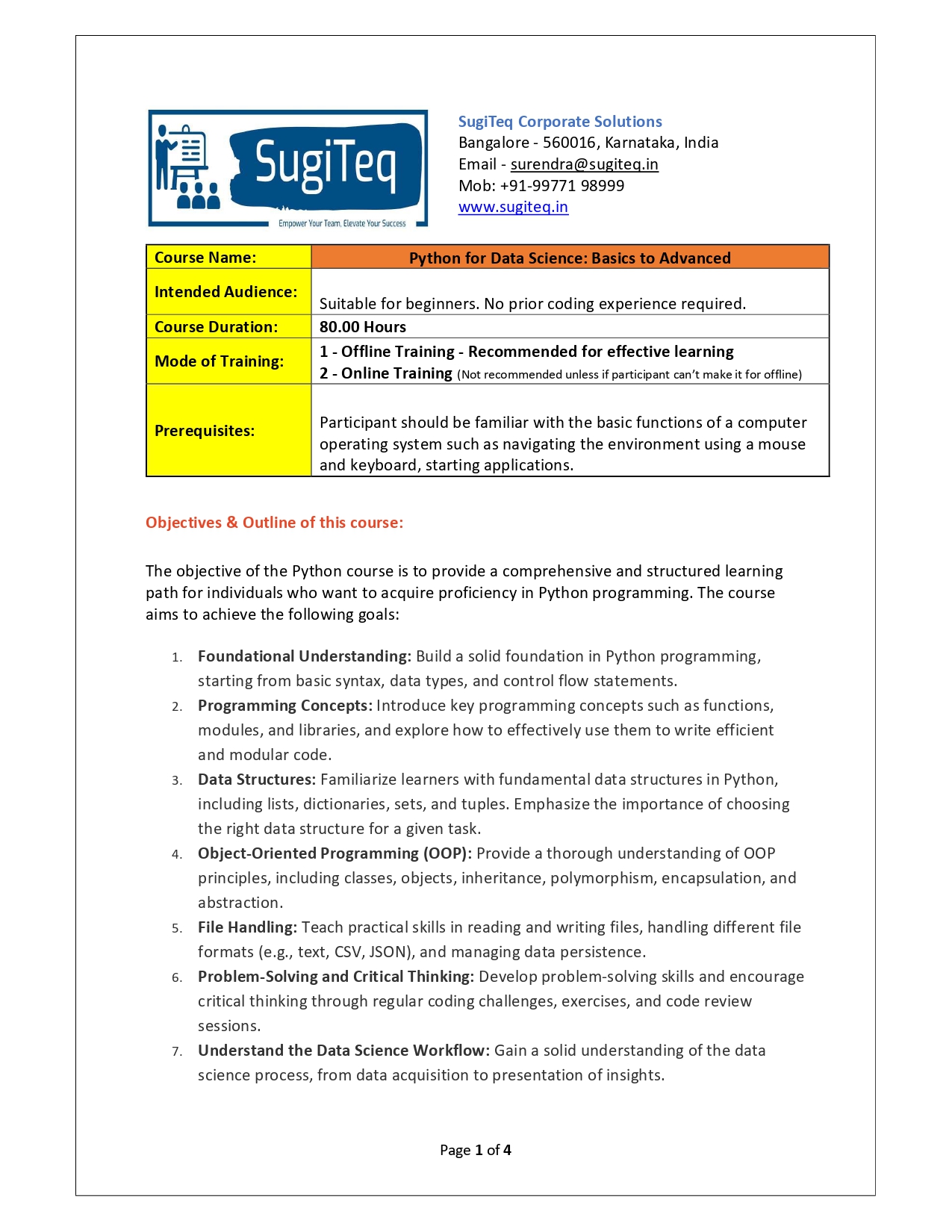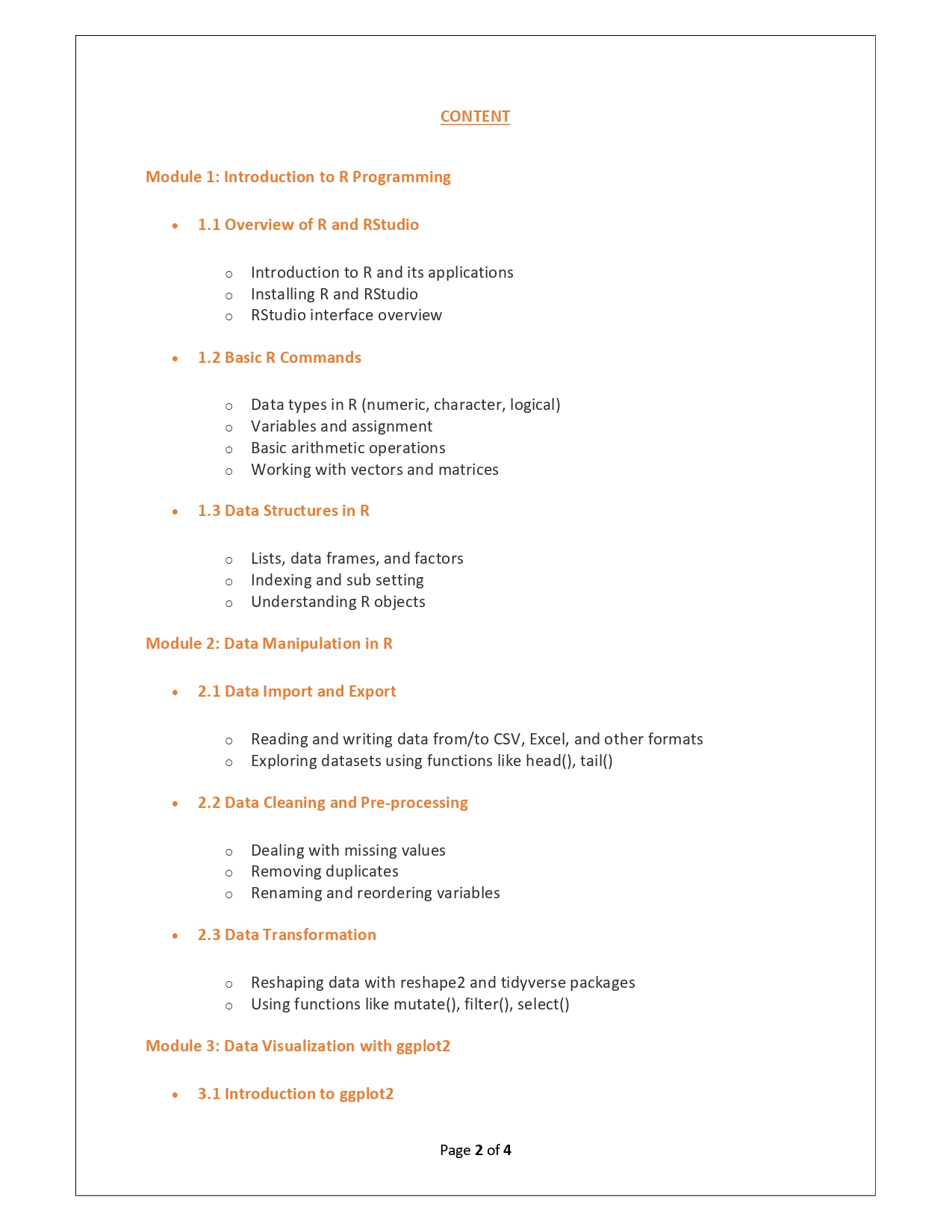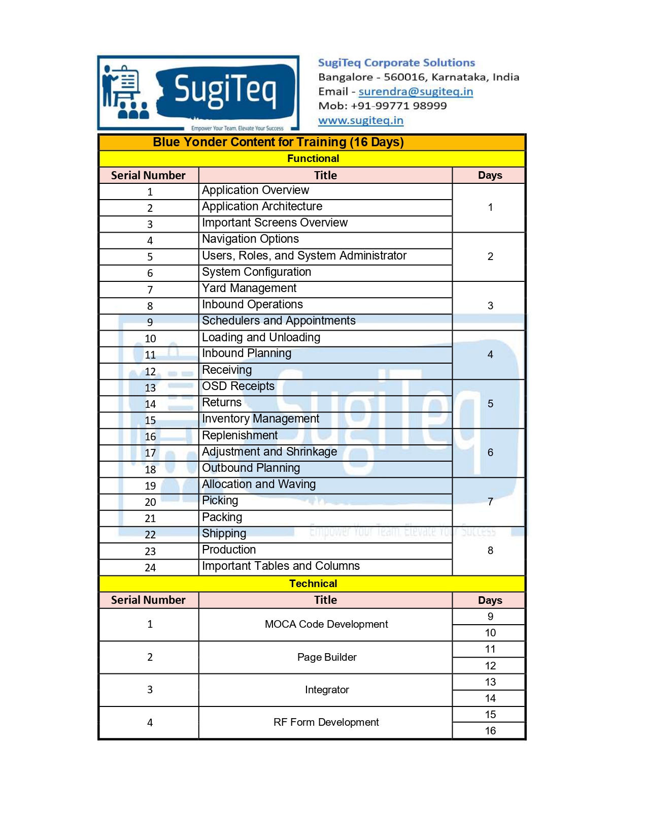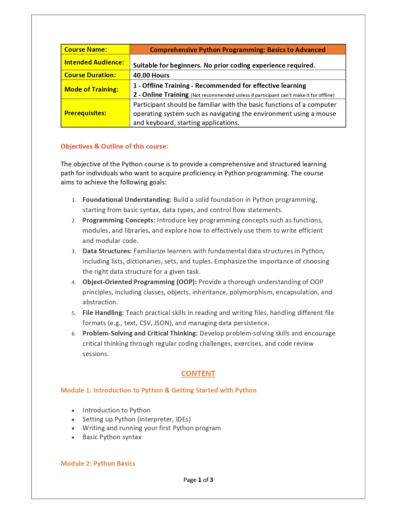 | Training Programmes | No of hours required (Aprox.) | Course Conent |
