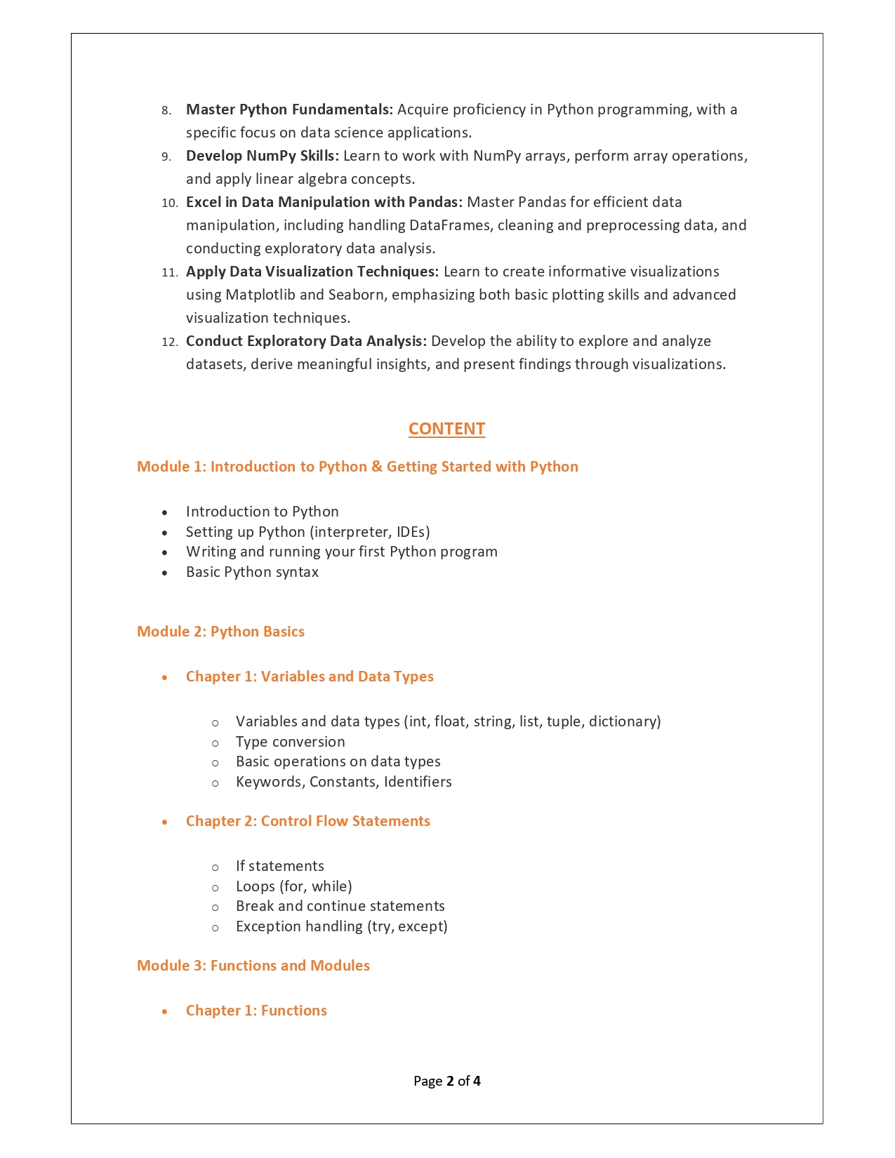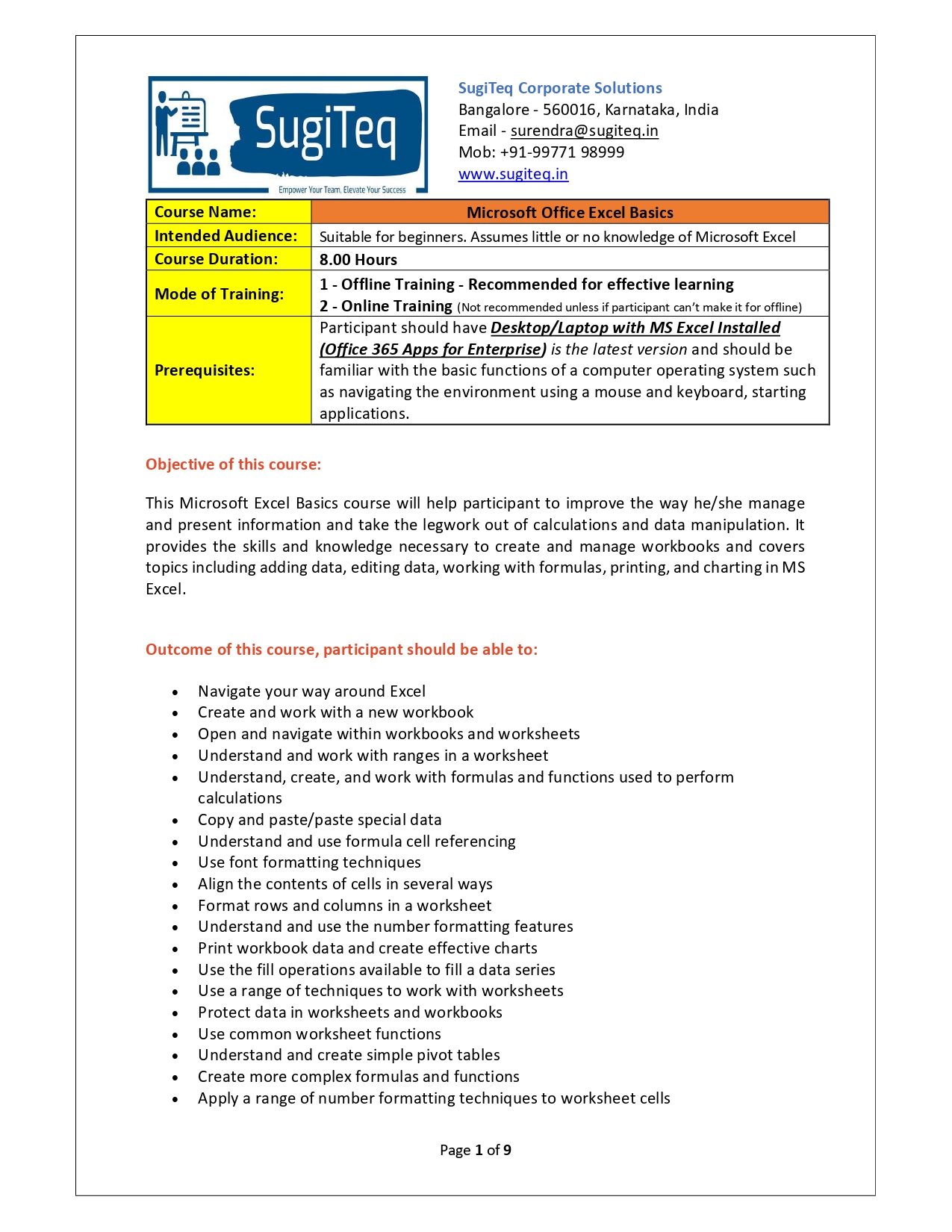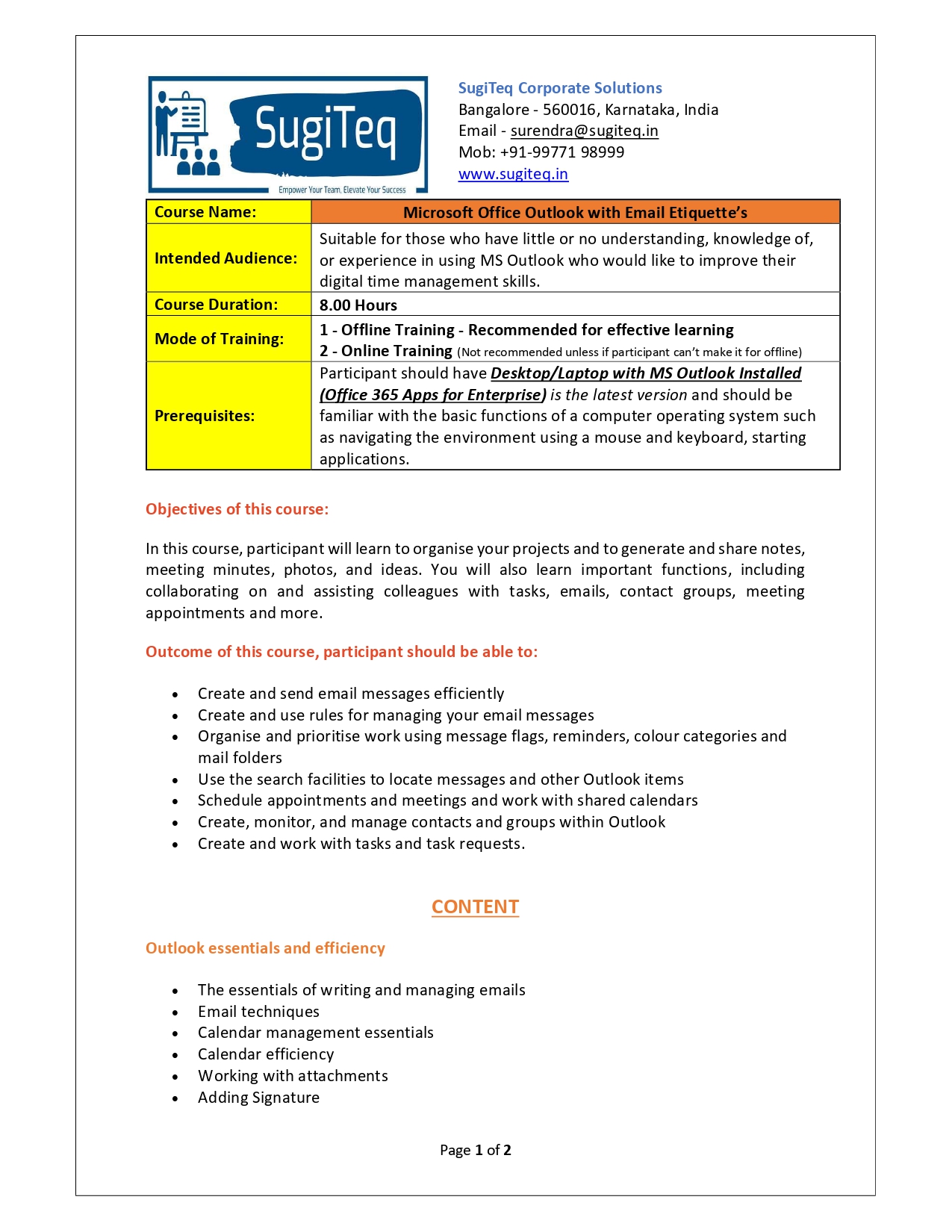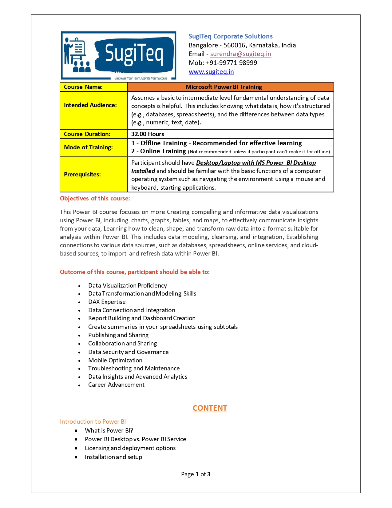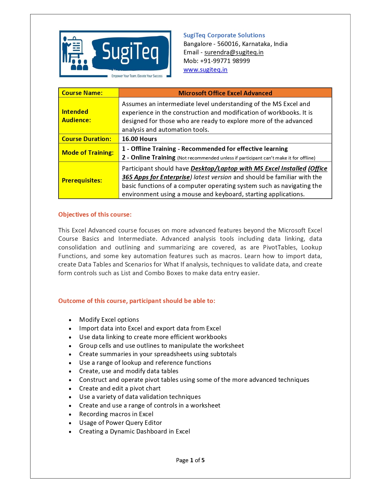 | Training Programmes | No of hours required (Aprox.) | Course Conent |